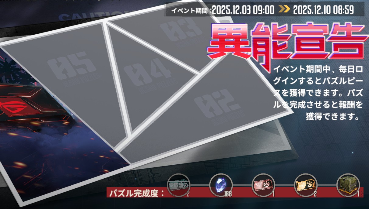 イベント期間中、ログインすることでパズルピースが埋まり、アイテムを獲得できます。